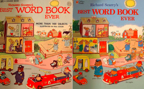 Flickr user Alan Taylor finds some interesting differences between his 1963 edition of Richard Scarry’s book and the more recent version he got for his kids. Annotated photos show point out the details. The “brave hero” rescues the “beautiful screaming lady” in 1963 but in 1991 its the “fire fighter” rescues the “cat in danger.”