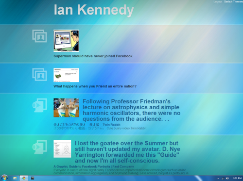 Stumbled across a quick and dirty side project that uses Facebook’s social graph api to pull your newsfeed and present an alternate display. Try it yourself at Facebook-me.com.