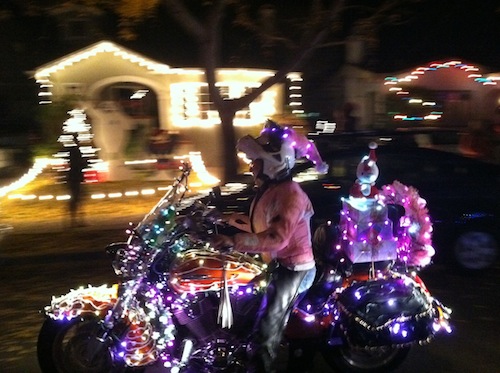 Over the weekend I got to play dream maker again. Each December, my street transforms itself into a carnival of lights. Each house on the 3200 block of Thompson Avenue in Alameda drapes itself in lights including the big pine trees down the center isle. This is a tradition that has been going on since the 1920’s and people come from all around the Bay Area to walk down the street each evening to take in the sights. Also part of this tradition is that all the dad’s volunteer to play Santa for visitors to the block and this past weekend was my turn.