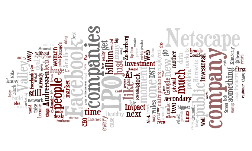 A quick glance at the wordle tag cloud analysis and it looks like wordle favored the lengthy Sarah Lacy piece on Facebook/Netscape. A longer piece means more words which would explain why Facebook, IPO, and Netscape are so big in word cloud.