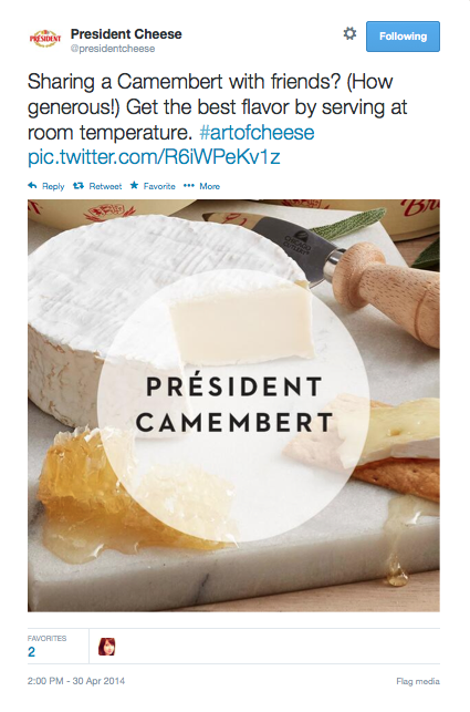 The client was nervous, this was their first foray into the wild, wooly world of the twitter. Corporate lawyers were all over them, pouring over every syllable. The head cheese at President Cheese demanded review of all creative, ensuring everything stayed on message. The campaign, carefully honed after months of travel up and down the corporate approval ladder was, “The Art of Cheese”