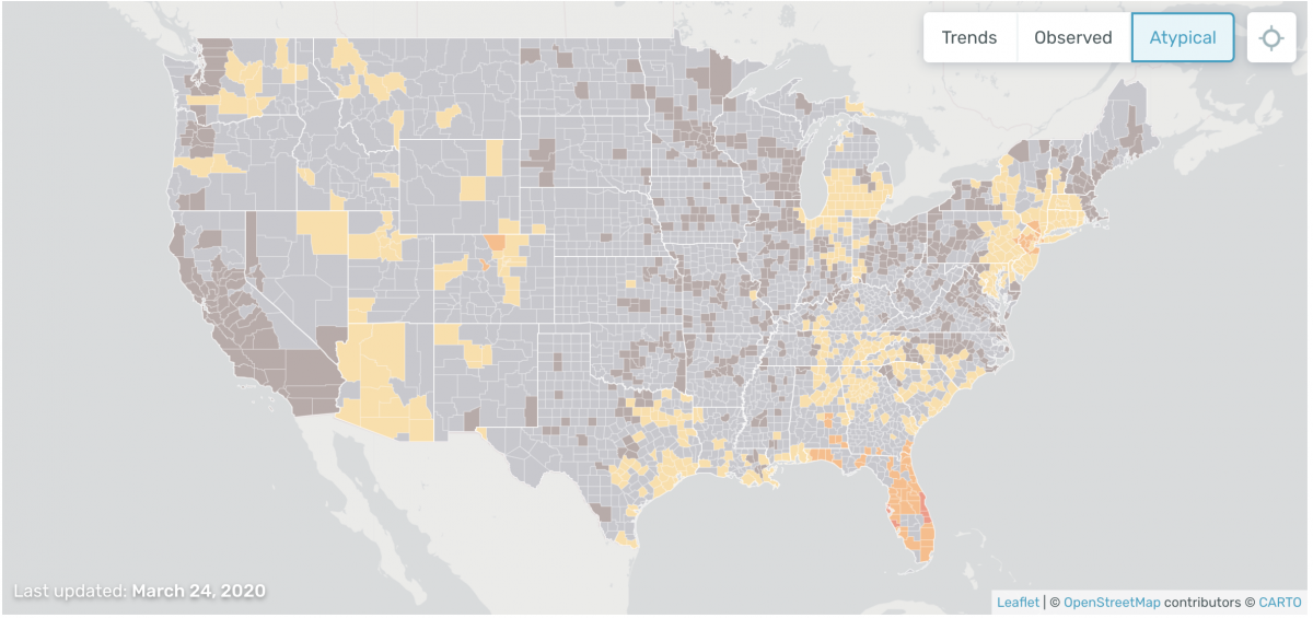 But this year is not normal. Kinsa is suggesting that the Atypical tab on their map might be useful as a predictor for where the next Covid-19 breakout may occur.