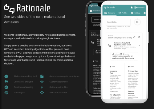 This AI tool is meant to assist business owners, managers and individuals in making tough decisions. All you have to do is enter a pending decision or indecisive options and the AI tool will list pros and cons, generate a SWOT analysis, or give a causal analysis to help weigh your options. You can create a persona to provide context or backstory and get a more personalized analysis.